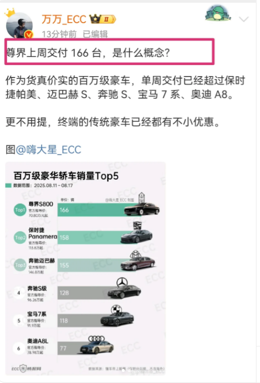 在多数人印象里金元速配,百万级豪华轿车市场一直是BBA、保时捷、迈巴赫等传统豪华品牌的“后花园”金元速配,但最近一款国产车型的横空出世,打破了这一格局——尊界S800在2025年8月11日-17日这一周,以166台的交付量拿下该细分市场销量TOP1,不仅超过保时捷Panamera(158台)、奔驰迈巴赫(155台)金元速配,还把奔驰S级(128台)、宝马7系(118台)、奥迪A8L(77台)甩在身后,这份成绩单让不少人直呼“没想到”。