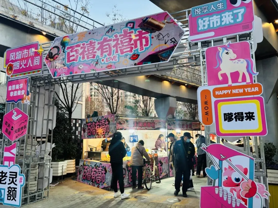 曹杨百禧公园举行“百禧有禧市·风物市集”,汇集近50个精心布置的摊位,为周边居民打造了一处集年货采购、休闲体验于一体的社区迎新空间。市集主打“风物”概念,汇集了无锡、扬州等沿沪宁城市的特色农产品与传统美食,也包含年糕等本地年节食品,旨在打造全龄化、充满烟火气的社区空间。元旦当日,市集增设了特别互动环节。