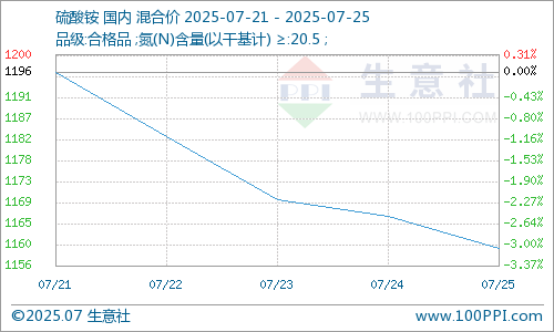 据生意社商品行情分析系统,7月25日国内硫酸铵市场均价为1160元/吨,较7月21日国内硫酸铵市场均价1196元/吨,国内硫酸铵市场价格下跌3.06%。
